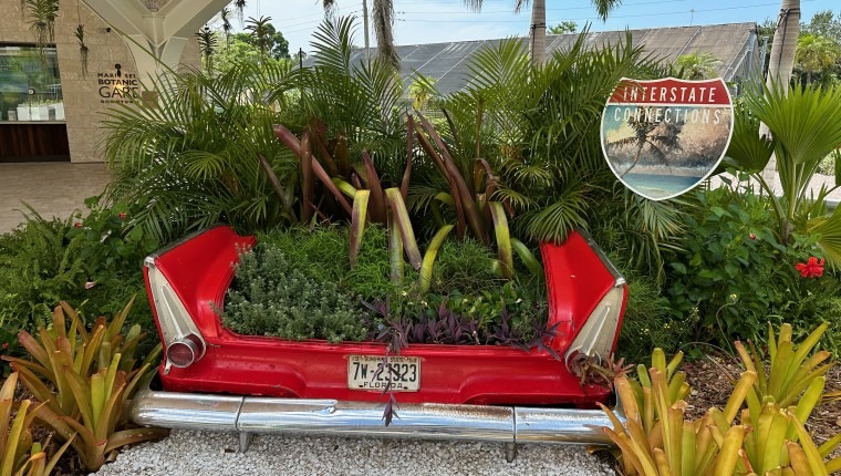 Next to the ticket booth in Selby Botanical Gardens’ Downtown Sarasota Campus is a red automobile lost in an overgrowth of tropical plants – only its rear end is visible, with even more plants filling the exposed trunk.