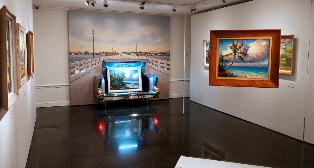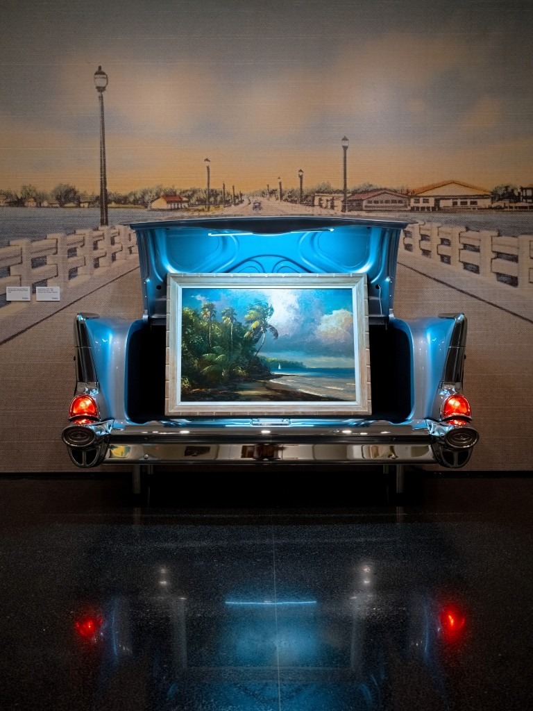 This automotive motif is repeated in the museum’s main gallery where instead of plants, a framed Highwaymen painting is propped up in the open trunk.