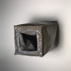 My work deals with this failure. The soft sculptures recall solid objects (shelves, boxes), but seem like they might fall apart at any minute. Stitched from coarse fabrics and stuffed with shredded documents, they bloat and pudge. Dye and ink splotch their surfaces, making them look raw in places and managed in others. Both glitzy and drab. Polished and dull. In this way, the constructions at once repel us and draw us in: a black box is both sinister and seductive, inviting the viewer to reach into the glossy interior without knowing what lies inside. Paper clay—looking just like chewed gum found stuck to school desks—holds together the seams of one sculpture, while the gold hoops dangling from it flaunt their sex appeal. Meanwhile, one form comes undone at the edges, its color faded like whitewashed graffiti. These pieces ask, what is our relationship to instability? How do our desires—for cohesion, for met expectation—implicate us? Over time, the sculptures sag. They slouch. They turn impotent, challenging our trust in systems and our reactions when they fail.