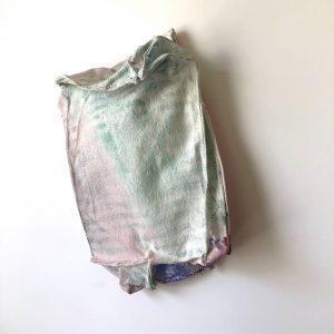 Limp Form IV, 2019, canvas, ink, acrylic, gesso, shredded documents, grommets, 11 x 9 x 3 inches