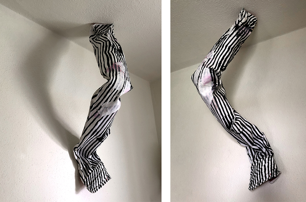 Hello and Welcome Back! Thought I would share this new installation piece: Leg with Louboutin, 2019, canvas, acrylic, ink, glue, paper, shredded documents, glitter, grommets, dimensions variable, installation