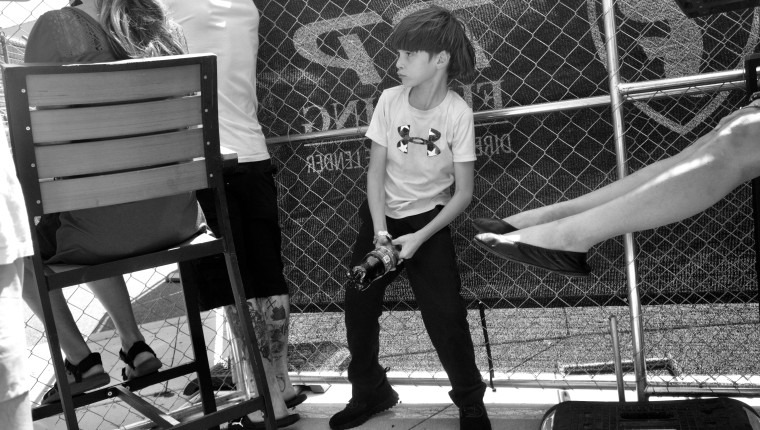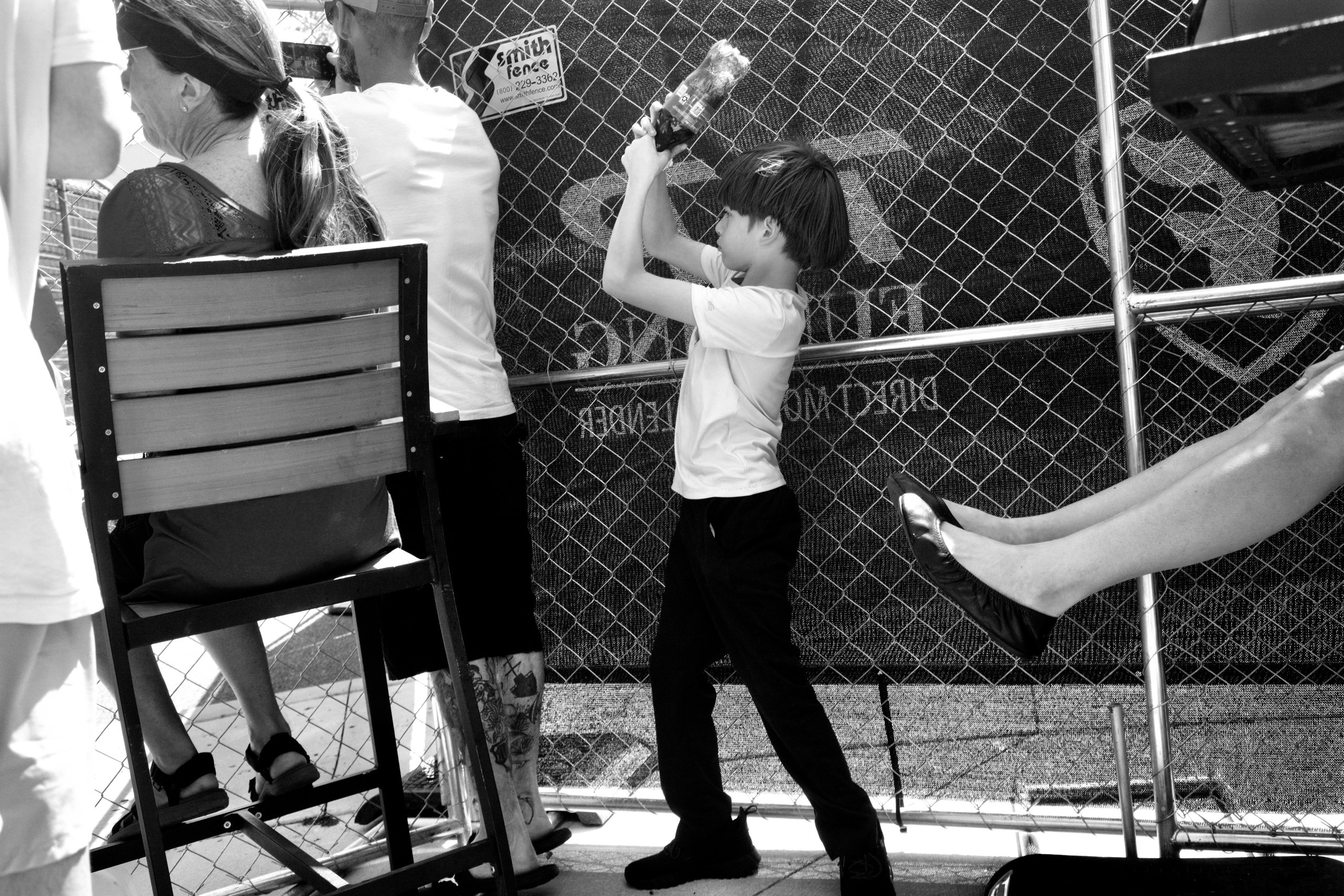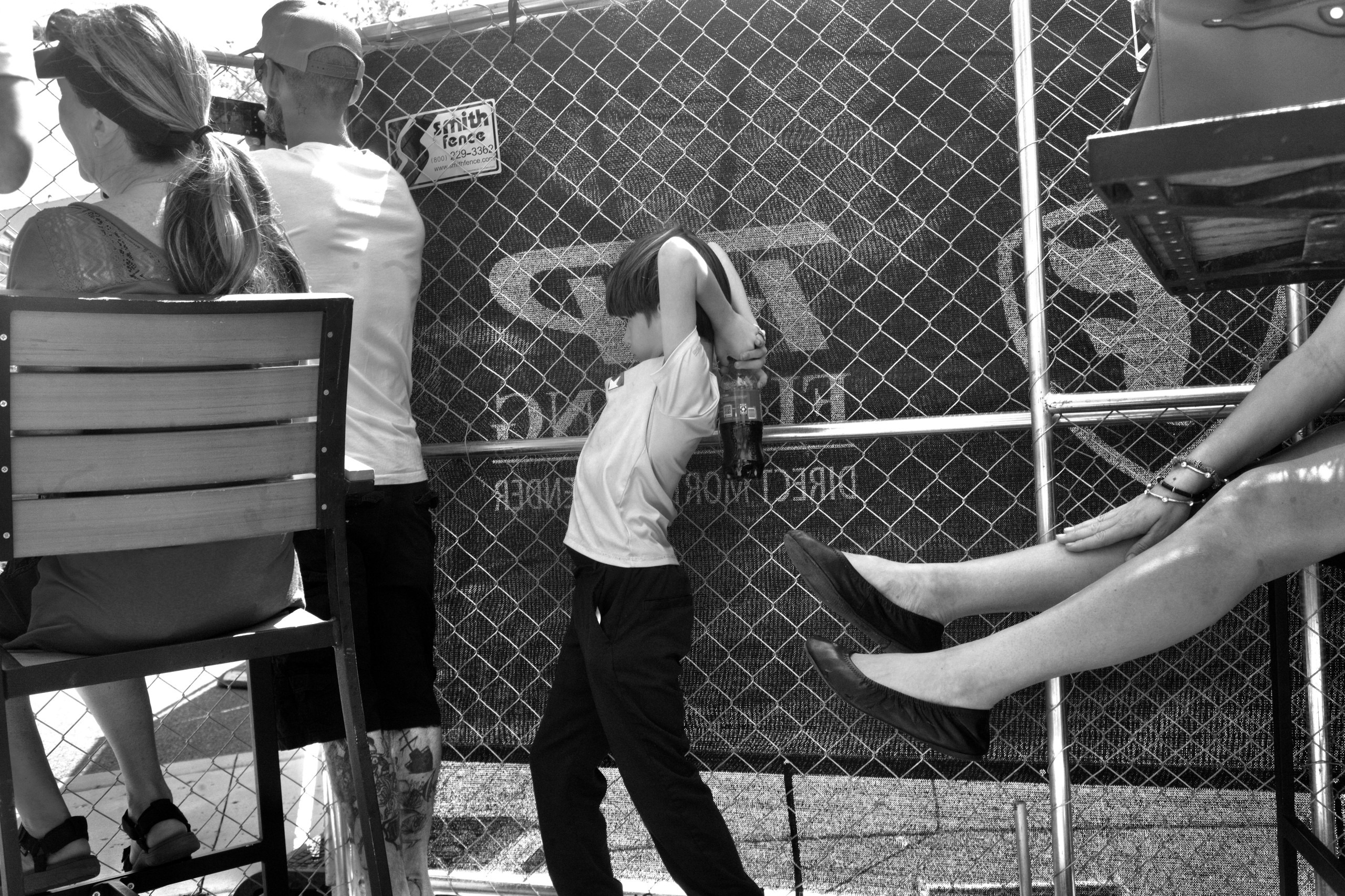 Like mine, the father is into race cars. Like me, the boy has an imagination and can turn a plastic bottle into a hammer. Perhaps he has a dangerous trickster brother. If he ever goes on tour, his kid mop-top will protect him. His mother’s stretched legs are sharp enough to slice an eye. A photograph needs discrete charm. One of Hitchcock’s mechanical pets flew into the frame. She kicked at it but I missed the shot. Fence as wallpaper. Ponytail as moody violin bow, black and white concerto. A house could drop on us right now and we’d still blame the gold standard for having to walk all the way back to our cars once the plastic bottle has disappointed the molotov cocktail. Either way, this unconventional family portrait is about to explode.