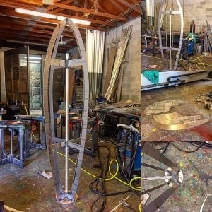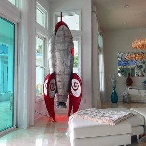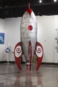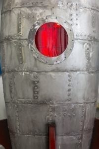 One challenging sculpture that I made recently was the “Old School Rocket”. The piece was 11 feet tall and included LED lights that could be seen in the port hole window and could be seen on the bottom. In addition, the piece included over 1,000 rivets.