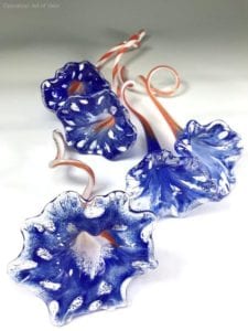 Mello sometimes works in warm reds, yellows and oranges or cooler blues, mints and teals. He forms contrasting patterns and wraps, playing with the glass’ clear and cloudy textures to make witching balls and blooming flowers. He gives each to his wife and daughters for their garden.