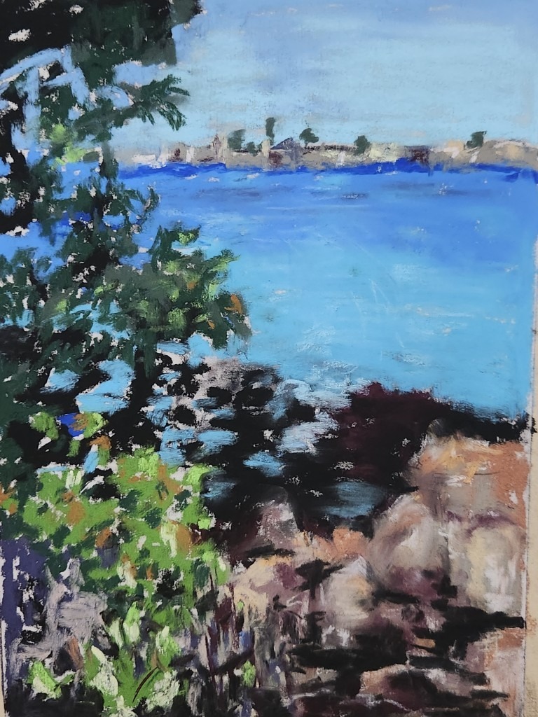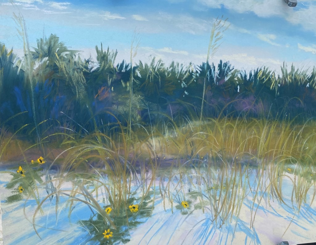 When I arrived, Joyce had already set up her easel at water’s edge and started to paint. Pastel in hand, she told me what she hopes to accomplish by visiting and painting places like St. Pete’s Bay Vista Park.