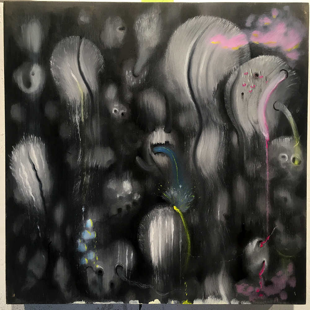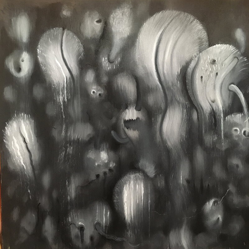 “I put some paint on a panel and kept sculpting it… then I woke up and it looked like this… Seems like a combination of Bosch, Tanguy, and soil microbes. Yummy:)”