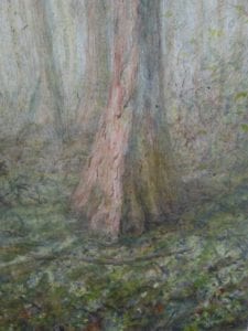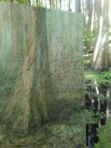 I work in fluctuating water levels. Somedays, I couldn’t reach the site as the water level was too high. Other times, the water level has noticeably dropped. I worked on this painting, Cypress Trunk, from time to time over two years. It is underdrawn with silverpoint, bamboo brush and ink wash. This last photograph was taken May 17, 2020:
