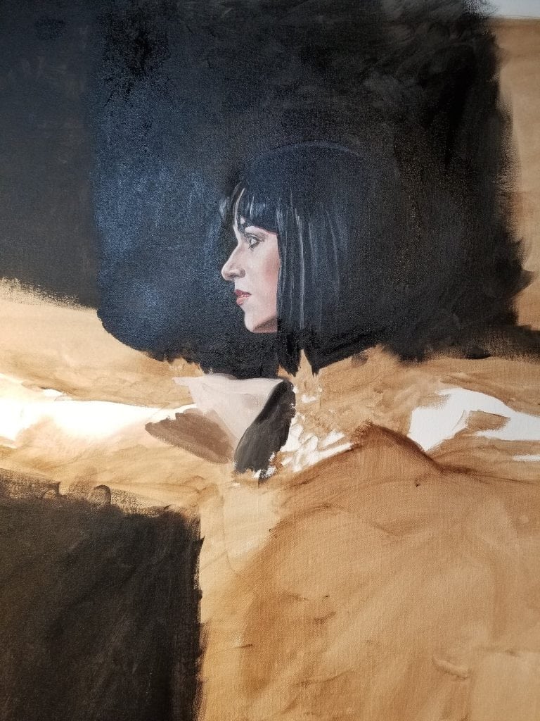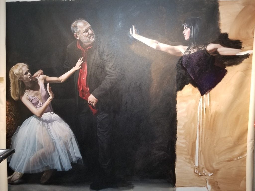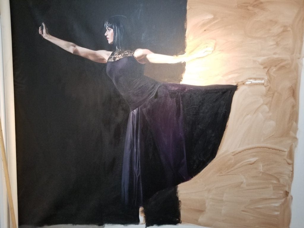 Just like with the other two figures, I start with the head. This is Madeline, a former prima ballerina with the Tampa Ballet. She was completing her associate’s degree at St. Petersburg College, where my wife and I teach. My wife knew her from two of her art history classes, where she was one of her best students. Madeline now attends the University of South Florida (USF) to continue with her bachelor’s degree in art history. But after-class conversations about the #MeToo movement with Madeline and Alexandra, her best friend and the other ballerina in the painting,  sparked the idea for this piece.