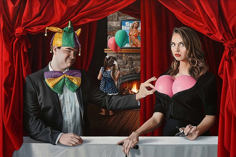 Realism artist Kevin Grass explores sexism and its effects upon the feminine self-image in this acrylic on panel painting entitled Clown. You can purchase this piece or fine art print reproductions of it here: “Clown” painting and prints, available on www.kevingrass.art