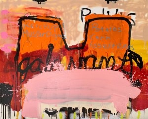 Originally this painting said the word Galavant. For me this is a reference to the unfettered access to deadly and completely needless assault weapons and other deadly contraband that is as ubiquitous and commonplace in the United States as hot dogs.