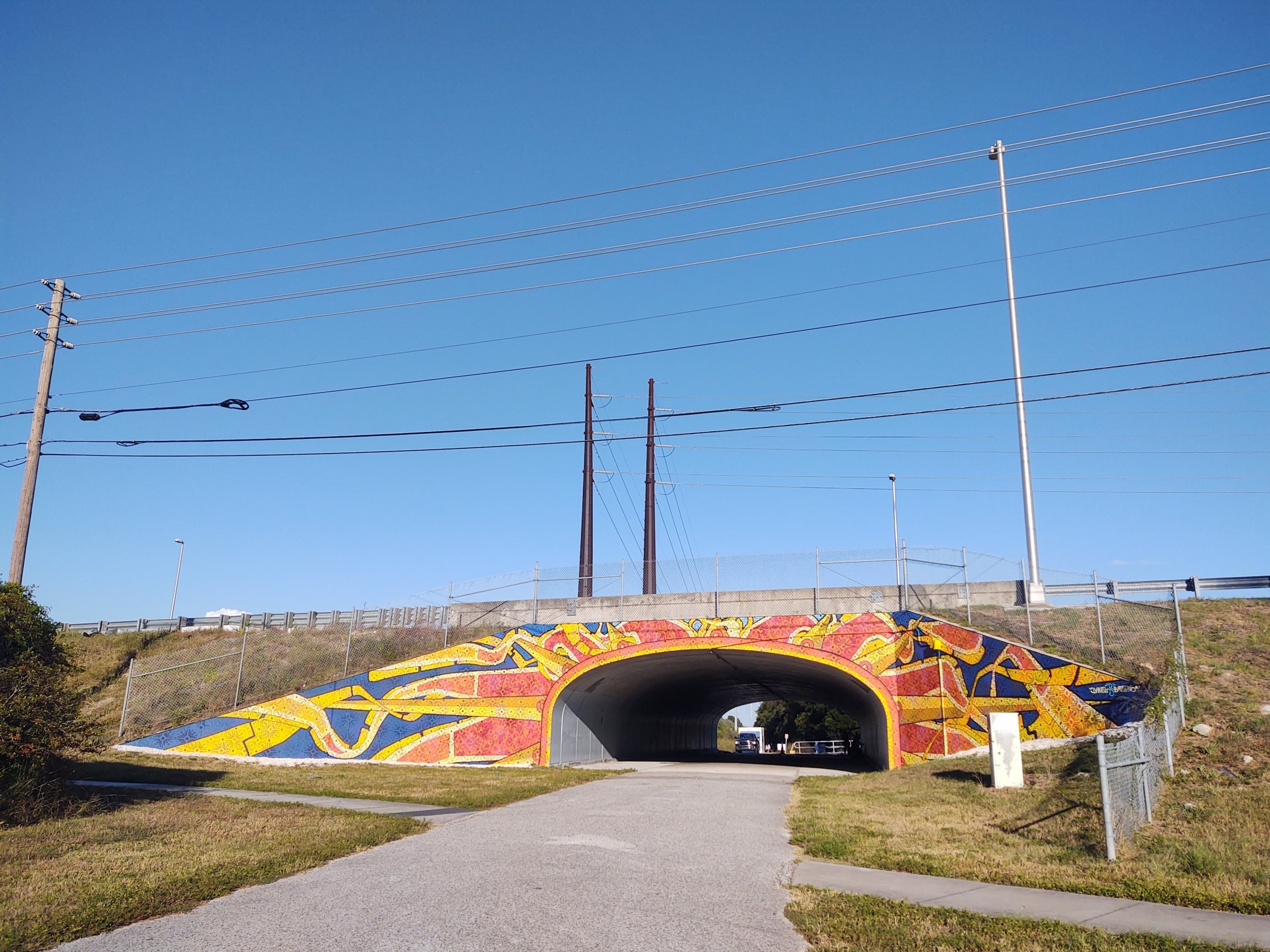 In Palm Harbor, Yhali Ilan and Taylor Smith painted murals across the tunnel entrances north of Wall Springs Park, at 3725 DeSoto Blvd, Palm Harbor FL 34683.