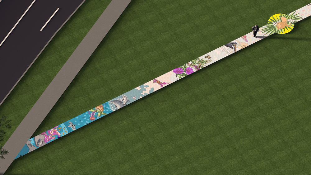 Miss Crit, who worked with Greenleaf to complete the design, initially offered up three ideas and three sketches – plants and flowers swaying in the breeze and rising toward the sun, a glimpse into the human mind with a pathway leading to a rising sun, and a phoenix rising from the ashes, trailing the word RISE. “I liked all three concepts,” Miss Crit admits.