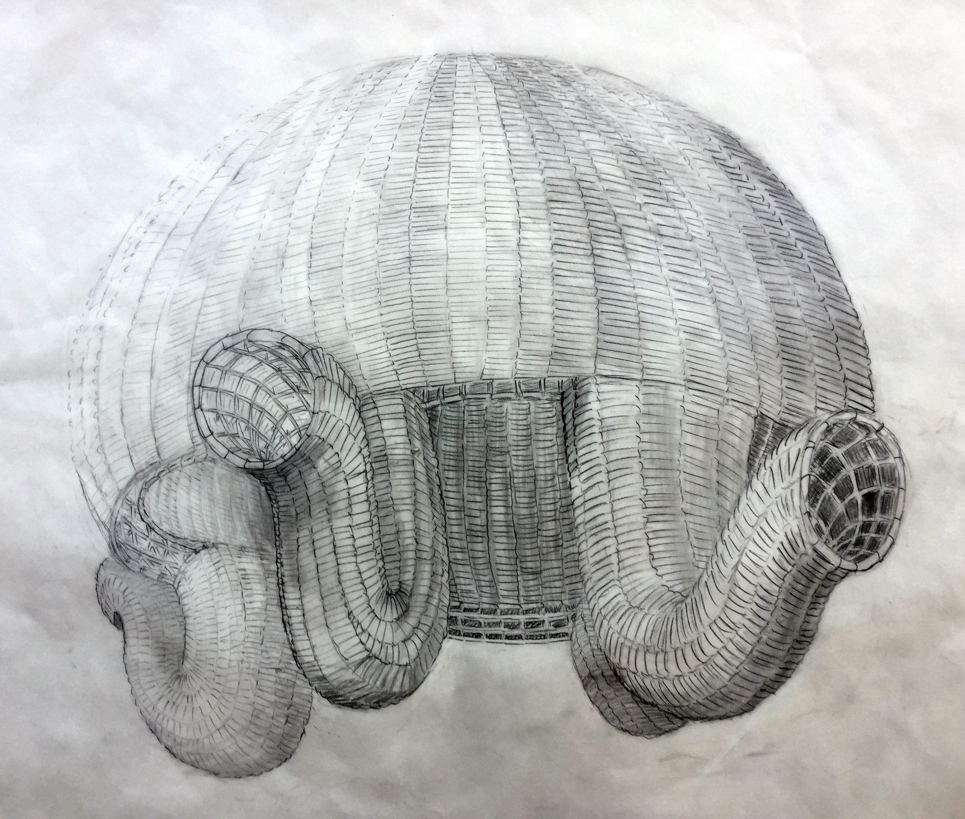 Quadropus will be a large dome-like structure with four curving appendages descending from its lower rim. The ends of each of the four members will vary in height from the floor so that viewers of all ages and sizes may be faced with one. Audiences will likely be compelled to look into the openings at the ends of the tubes, however, it is important to note that this will not give a complete view of the form or its inner structure. Instead, guests will likely have to get lower, perhaps even crawl on their hands and knees to go underneath the expansive dome, and from this lower vantage point, gain a much greater perspective. From below, one may recognize the intricate and orderly construction patterns and experience the true nature of the form.
