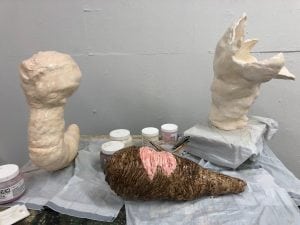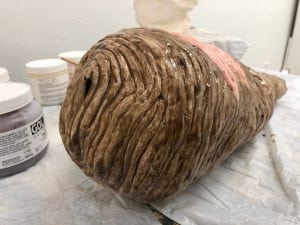 I painted some of the “risky” colors onto the new worm piece, and I remember why risks are uncomfortable haha. I’m just not sure at all if this is working well. Is the “symbol” too much? Not natural enough? What about that weird, warm brown color? It’s not the same color wet as it is dry. Whatever. I’m just going to go for it. I still believe it could turn out well, but worst case scenario, I make a sculpture bad because of the color, and maybe I just gesso it again and leave it for another day. Ultimately not a big deal, but when I’m working in my studio and trying something risky, my perspective can get a little narrow and I want to panic and go back to what I’m used to. At the same time, I’m so tired of what I’m used to.