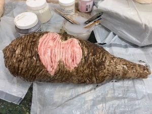 I painted some of the “risky” colors onto the new worm piece, and I remember why risks are uncomfortable haha. I’m just not sure at all if this is working well. Is the “symbol” too much? Not natural enough? What about that weird, warm brown color? It’s not the same color wet as it is dry. Whatever. I’m just going to go for it. I still believe it could turn out well, but worst case scenario, I make a sculpture bad because of the color, and maybe I just gesso it again and leave it for another day. Ultimately not a big deal, but when I’m working in my studio and trying something risky, my perspective can get a little narrow and I want to panic and go back to what I’m used to. At the same time, I’m so tired of what I’m used to.