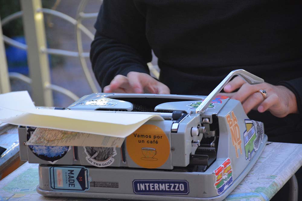 The installation features interactive writing prompts, live solo performances by members of the Florida Orchestra, and live poetry creation by Giovanni Cerro aka Gio Typos, who creates on-demand, personalized poems by request, on a typewriter.