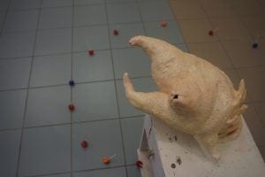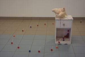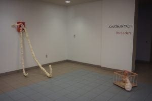 I tried to even out that 1:1 ratio by playing with 1) the heights of some sculptures and 2) the general display of others. Teenage Talk on the right, for example, is fundamentally a pretty traditional sculpture display: a sculpture on top of a pedestal, here with a nightstand being the simulacrum of a pedestal. The lollipops sashaying out of the nightstand, however, make the piece feel more integrated with the environment around it, which slightly blurs where the total sculpture begins and ends. It’s not just a sculpture on top of a display, and the sculpture and the display really are not as separate from each other or the room as much as some sculptures normally are. Parts of this sculpture you can walk over or through instead of just around. Some sculptures incorporated other objects but were only slightly analogous to sculptures, like the puppy pads on my worm piece, Strobila 1, or the baby pen in Bloomers. My first wall sculpture was made because I was scared of all the empty wall space with the filled hallway of sculptures.