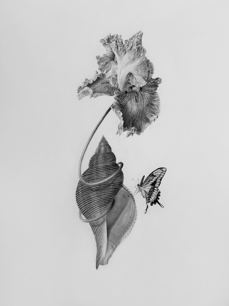 The inspiration for “Microcosm” comes from a quote by geologist Jan Zalasiewicz: “The Anthropocene represents a new phase in the history of both humankind and the Earth when natural forces and human forces become intertwined, so that the fate of one determines the fate of the other.” Iris flowers, frequently featured in historical still life paintings, have long symbolized hope. These delicate blooms carry a message that extends beyond their petals.