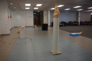 I tried to even out that 1:1 ratio by playing with 1) the heights of some sculptures and 2) the general display of others. Teenage Talk on the right, for example, is fundamentally a pretty traditional sculpture display: a sculpture on top of a pedestal, here with a nightstand being the simulacrum of a pedestal. The lollipops sashaying out of the nightstand, however, make the piece feel more integrated with the environment around it, which slightly blurs where the total sculpture begins and ends. It’s not just a sculpture on top of a display, and the sculpture and the display really are not as separate from each other or the room as much as some sculptures normally are. Parts of this sculpture you can walk over or through instead of just around. Some sculptures incorporated other objects but were only slightly analogous to sculptures, like the puppy pads on my worm piece, Strobila 1, or the baby pen in Bloomers. My first wall sculpture was made because I was scared of all the empty wall space with the filled hallway of sculptures.