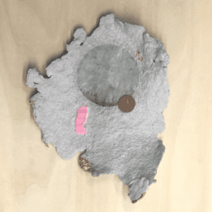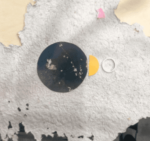 As I looked over the pieces I’ve been working on, I was struck by how reflective they are. There is something calm, soothing about them. The colors are gentle, with the occasional surprise pop of brightness. Nothing too striking. The paper substrate shapes are indefinable and not finite. They are simultaneously not infinite, and not finite. Yet contained within each unnameable form, you find a window, a circular view to some natural world, some quiet escape.
