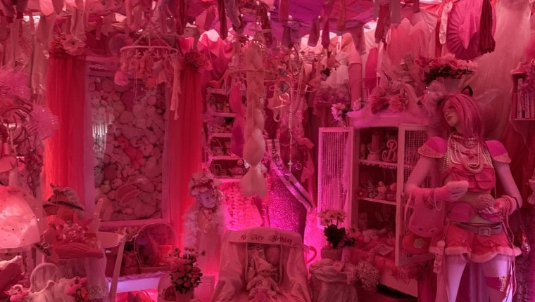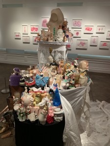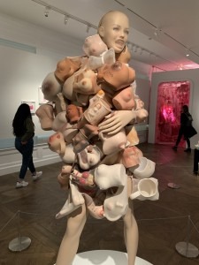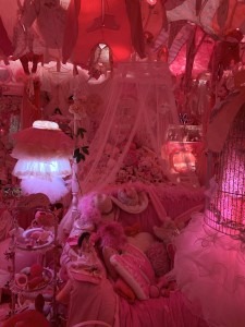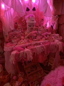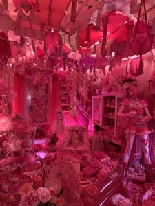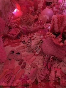 There was another sculpture of collected objects that were incredibly thought provoking and interesting. I then finally stepped into the “Pink Room” which is supposed to resemble a womb. I found it actually very peaceful to go in there. There were pink things everywhere along with pink lights and music that sounded like it came from a music box. There were mirrors as well which added to the dizzying effect. I found these incredibly interesting and loved seeing all of the different objects that she had collected. It also made me reflect alot on Barbara Kruger’s piece “I Shop therefore I am”, especially in terms of how women are the largest consumer of products. I thought a lot about the performative aspects of gender and how being a woman there is an expectation to have your favorite color be pink and to cover yourself in delicate fabrics, these suggested objects were next to very aggressively pink sex toys and pink clothing. It truly is not for the faint of heart but it was incredible.