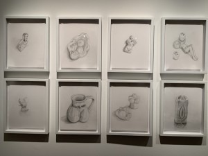 Along the walls are paintings and drawings of these individual objects that include decapitated women and cropped body parts. I love the restriction of this figure that looks like its almost screaming and trying to escape from the breast mugs that seem to engulf here. I love the play of exposed body parts simultaneously covering the mannequin. These cropping of body parts as objects really resonated with me.