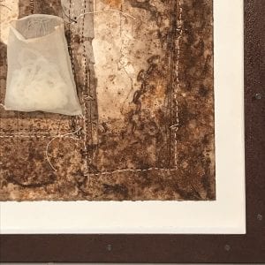 Encaustic, Cotton organza, rice paper, rust, tea, thread, string, on paper on panel, modeling paste on panel, rusted steel frame