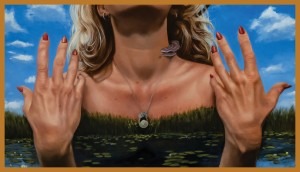 Adorning her neck she wears a necklace holding 3 small mementos, a shell, a bird, and a  token. Each charm represents the aspects of life we hold dear, including the comforts of home, our connection to nature, and the optimism of looking towards the future. Worn close to her heart, these symbols reflect the human longing for belonging and love.