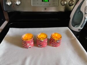The votive holders are recycled Oui glass yogurt containers. So ironically I’m really paying for the containers. We are not that crazy about the yogurt and prefer the vanilla Greek style with fresh fruit and nuts instead.