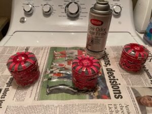 The Dollar Tree tea lights fit the bill. I’m making “holders.” Also we’ll be hanging LED string lights.