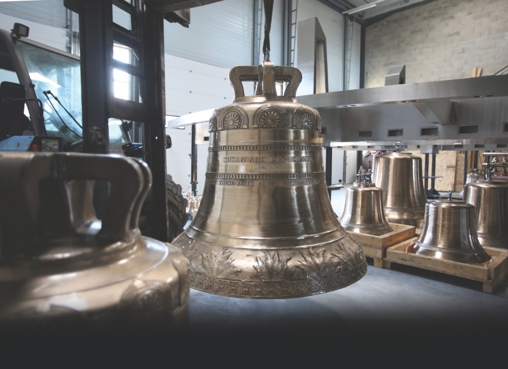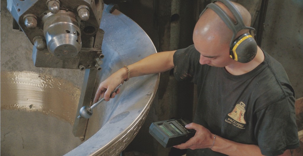 Each bell is individually designed to play a specific note – a tuner precisely adjusts the bell’s harmonics by etching the interior of the bell, reducing its thickness ever so slightly to achieve a desired musical effect.