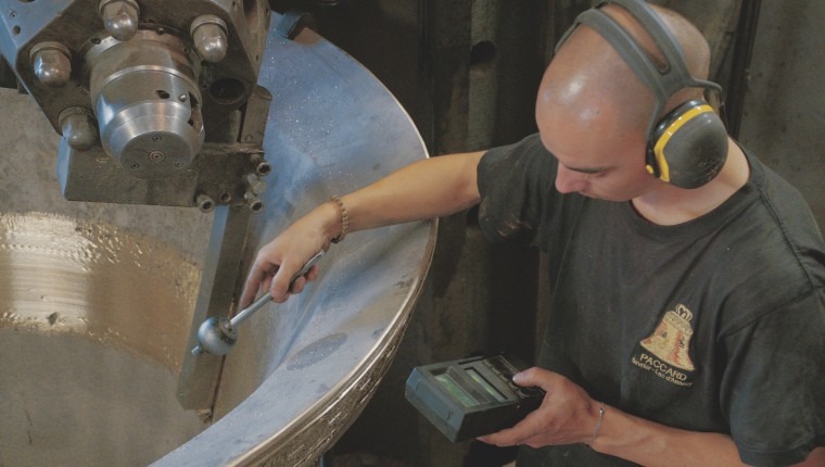 A worker at the Paccard Bell Foundry tunes a bell for UT’s Ars Sonora. The Paccard tuning method requires precision and patience, as the tuner must continuously pause in the etching process to test the bell’s harmonics. This artisanal process has been in use for more than two centuries and creates the exacting musical quality for which Paccard bells are known – photo by Roundhouse Creative