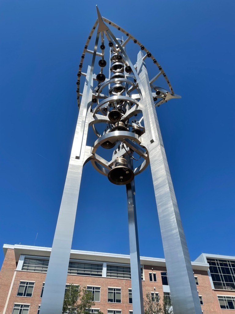 The majestic musical sculpture soars 105 feet above the Sykes Plaza in the heart of the UT campus, intended to be a sentinel of inspiration and calm.