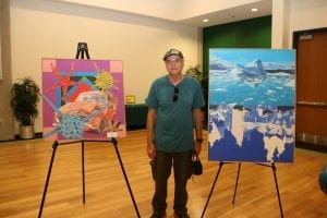One artist, John Gurbacks, showcased three pieces at the event. Gurbacks has worked full-time as an artist since the 1980s. “I think that it is important to address important issues that relate to the environment [in artwork],” he says. One of his oil on canvas paintings, Fender Bender, depicted a car smashing into several sea creatures. He says that the car in his painting depicts the breakdown of technology. Another one of his paintings, which was untitled, showcased glaciers and presumably the bottom of the ocean, but he says that part is up to the interpretation of the viewer.