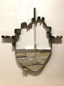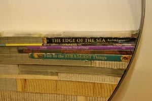 The top of the piece is a book titled Into the Unknown which is the beginning of exploration, of experiments, based on whatever questions and hypothesis the scientist feels necessary or important to research. Cross-sections of nonfiction books, fiction and poetry represent layers of the ocean floor. Most have the titles hidden, just the edges of the pages visible. Titles you can see include Ann Morrow Lindbergh’s Gift from the Sea, Billy Collins’ The Art of Drowning, 20,000 Leagues Under the Sea, Fish do the STRANGEST Things, The Incredible Water Show and The Odyssey.