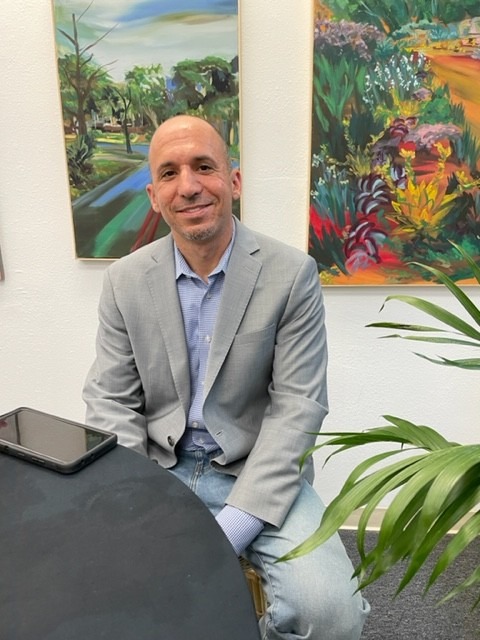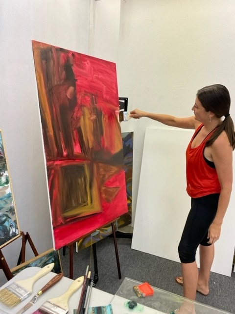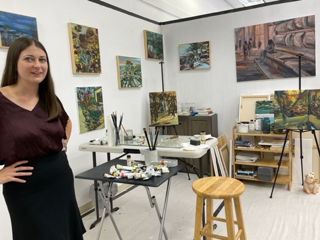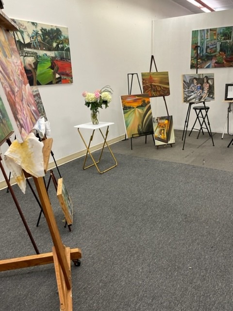 She finds her 160 sq. ft. mall studio/gallery space works well for her as it’s convenient, affordable and provides adequate space to teach painting to small groups. She hopes to develop an art school where she devotes half her year in LA and the other half here in Florida.
