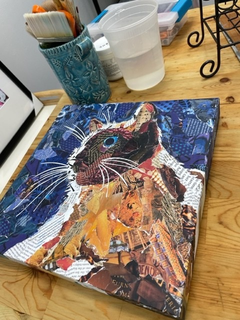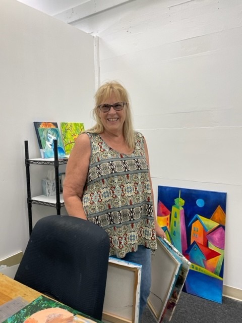 Mixed Media Artist Debra Yabczanka, who lives near the mall, finds her new studio an incentive to complete work. Yabczanka does acrylic painting, collage, mixed media work, pottery and crafts lampwork glass beads. Her wall space functions primarily as a retail gallery. A small table provides her working studio for painting, collage and mixed media work.