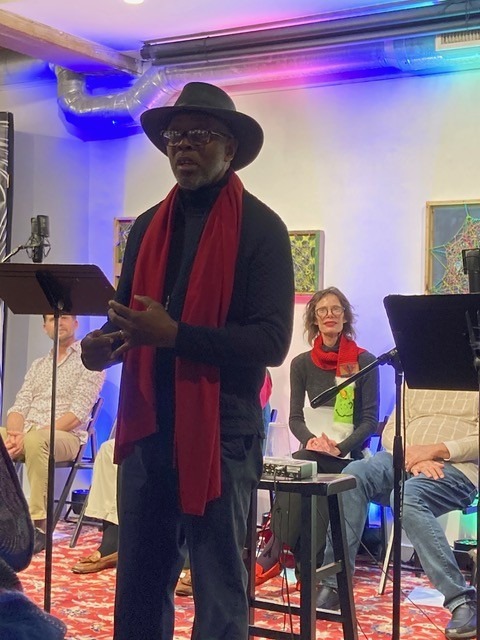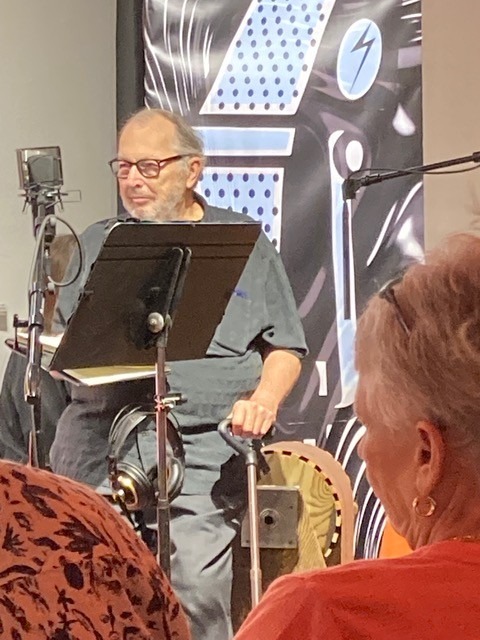 The Studio@620 co-founder Bob Devin Jones introducing the last Radio Theatre Project show of 2022 (“Bob is the new guy,” joked Paul Wilborn at the piano, “be nice to him.”)