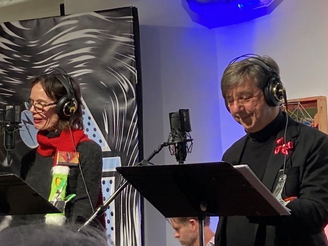 Unlike a stage production which holds multiple rehearsals because you want it to be the same every night, these radio plays only have one. “For radio you want a fresh response,” says Mimi Rice. “I’ve created my character and hear the other and we react to each other. At a table rehearsal the actors read through the script together followed by a tech rehearsal to coordinate the sound effects, position where we sit and set the mic stands for heights. Some of us are very tall and some of us are very short!”