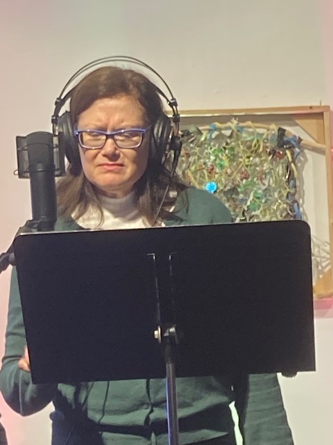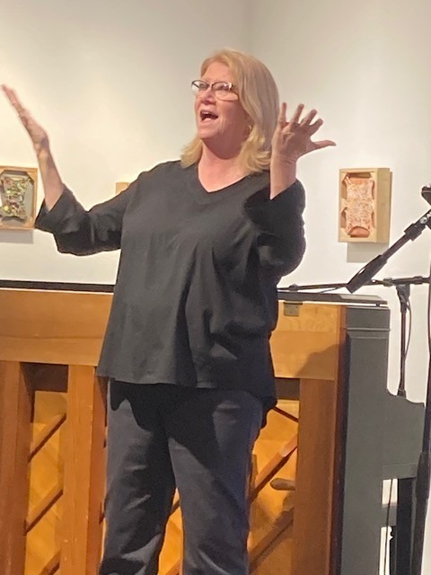 Watching someone tell a story without words is mesmerizing. “Some people tell me they close their eyes and listen during the live performances — radio, after all, is called the ‘theater of the mind,’” says Bonnie Again who began as an occasional actor with the project but is now its director, “but others tell me that they find themselves watching Carol signing throughout the evening.” Her work is a performance in itself.