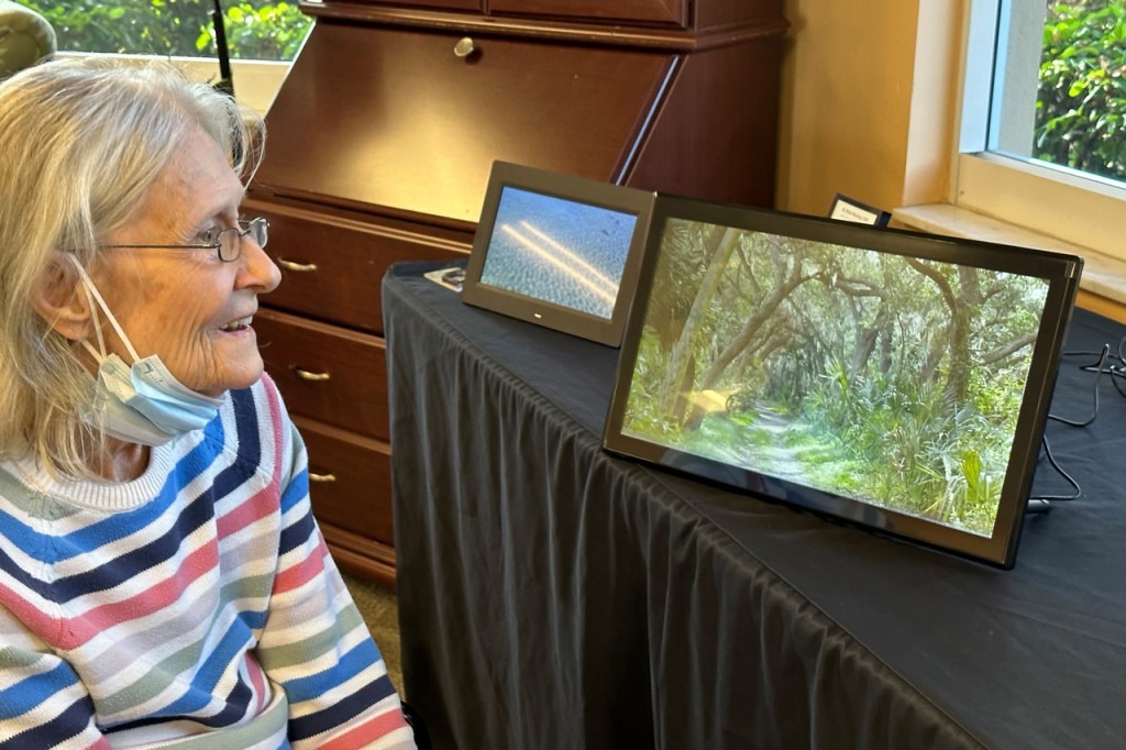 On November 2, at an invite-only reception for Westminster residents, I unveiled the “St. Pete Moving Still” frames. Since then, Nursing Center residents have been able to borrow these portable frames for their rooms. Priority was given to those who can’t leave their rooms any longer. Several frames are also accessible in shared community spaces.