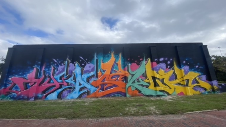 “I normally freestyle all my work, so this one was a bit of a challenge for me. The size of the wall was bigger than anything I’d painted before. I had a few rough sketches I went off of to get my basic design on the wall and tweaked it accordingly until I was happy with it,” Tasko said of the bright, loud mural.