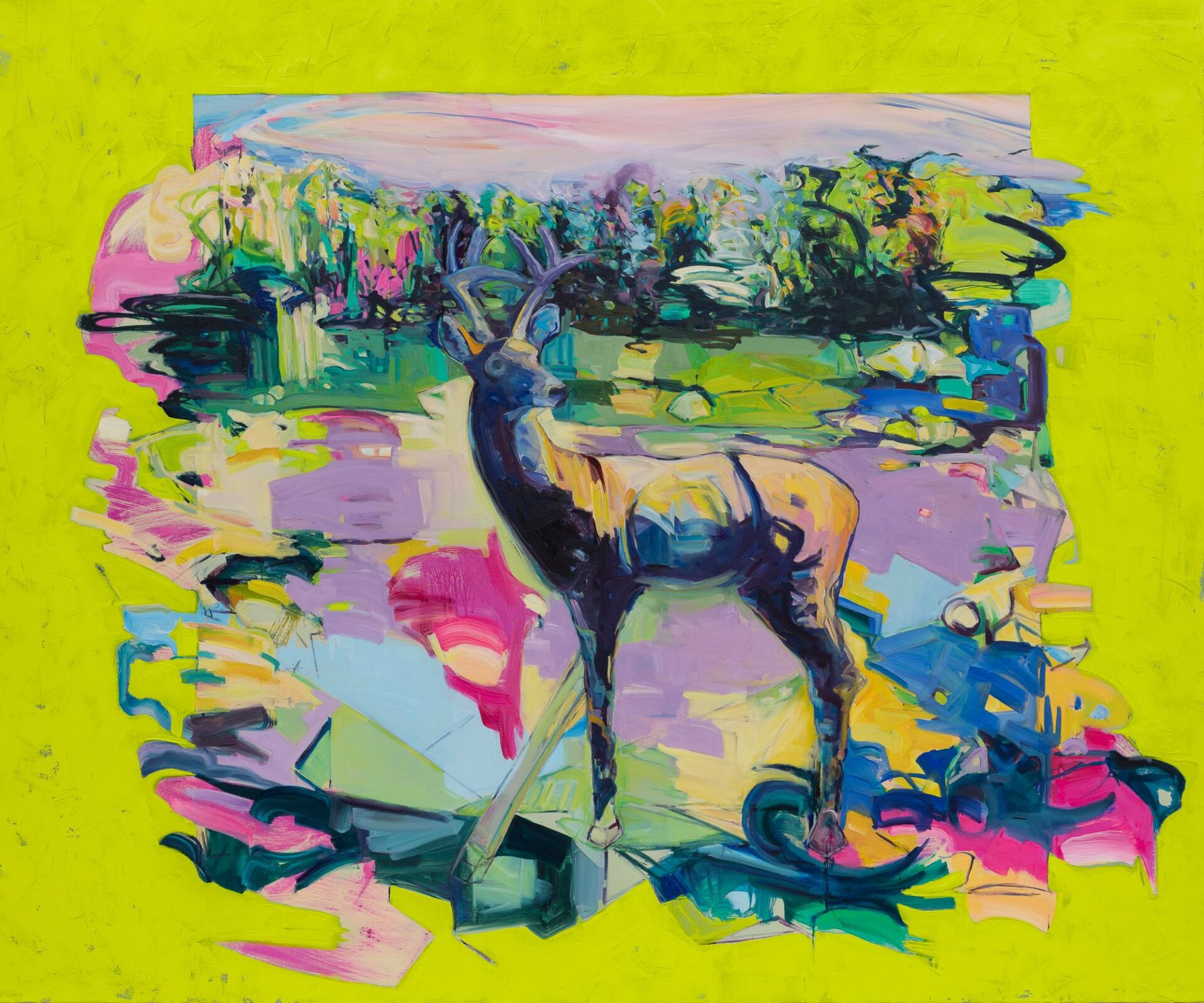 Dolores Coe visited an archery range filled with life-size plastic animal targets. Also working from her own photographs, she uses vivid color and animated brushstrokes to create visual environments that come to life and leap off the canvas.