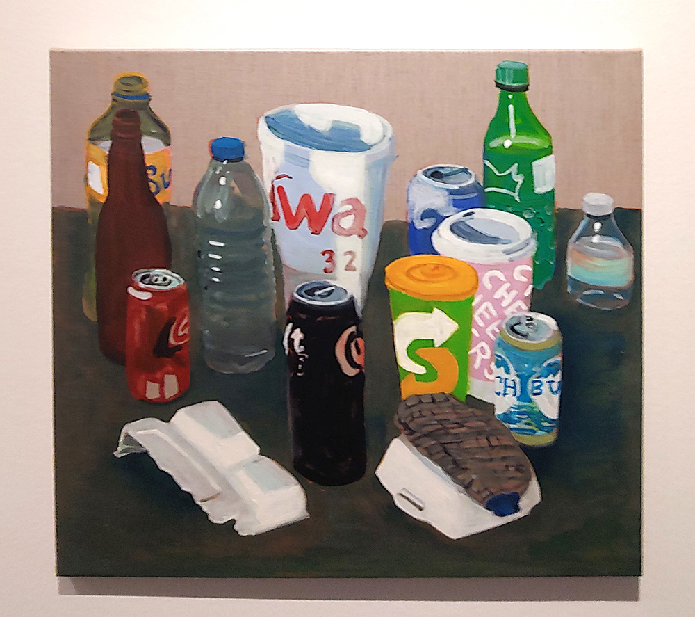 These small oil paintings remind one of Giorgio Morandi’s (1890-1964) tabletop arrangements of ceramic vessels; only this time we see plastic and Styrofoam containers decorated with familiar fast food logos. Johnson’s use of a bright, wide-spectrum palette applied with playful brushstrokes gives a celebratory air to these mass-produced, discarded objects.