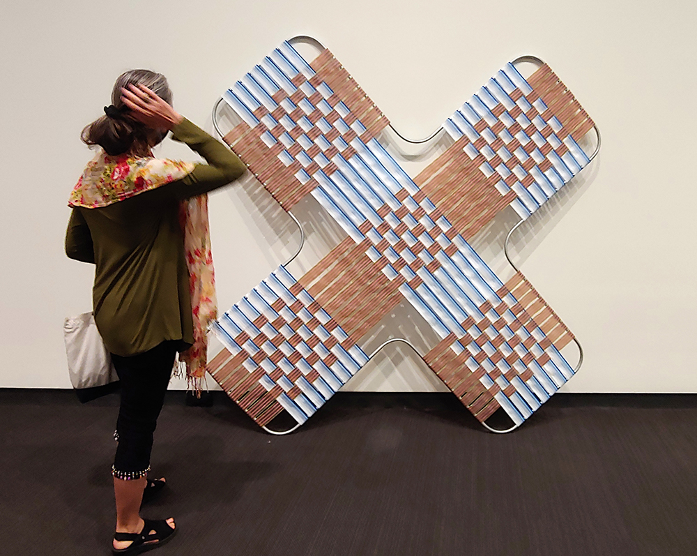 Three-dimensional work is also represented. I audibly giggled with surprised delight when seeing Matthew Wicks’ steel and webbing constructions reminiscent of cheap folding lawn furniture. These witty creations are wonderfully unpretentious and disarming yet fulfill all the requirements that make for engaging art. In keeping with their humble sources of inspiration, these pieces simply rest on the floor and lean against the wall.