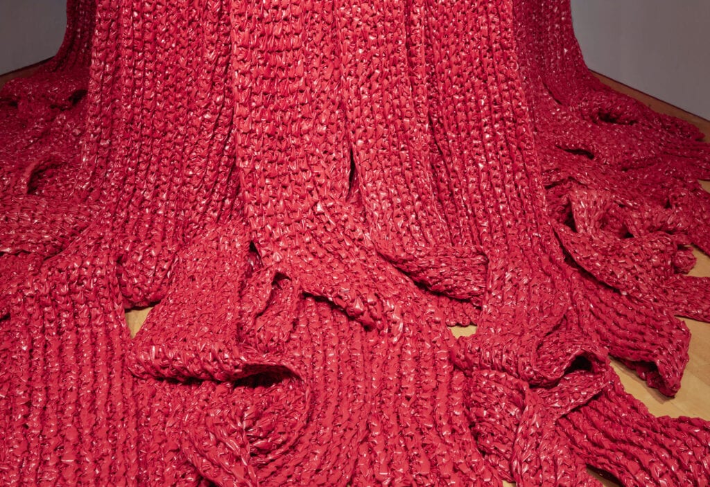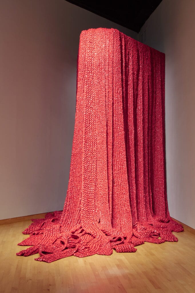 Opposite in the 45-degree corner is Akiko Kotani’s dramatic Red Falls, a continuous glissando of the harp, streams of deep red cascading from 12 feet up, forming a river delta on the floor. Red is such an iconic color, referencing danger, revolution, passion, boldness, blood. In this case that of women, endlessly flowing from an unseen/unknown source, like the un-recognized mundane labor of women, the complex simplicity of daily repetition pouring out, resulting in a cornucopia of fruits which we all consume.