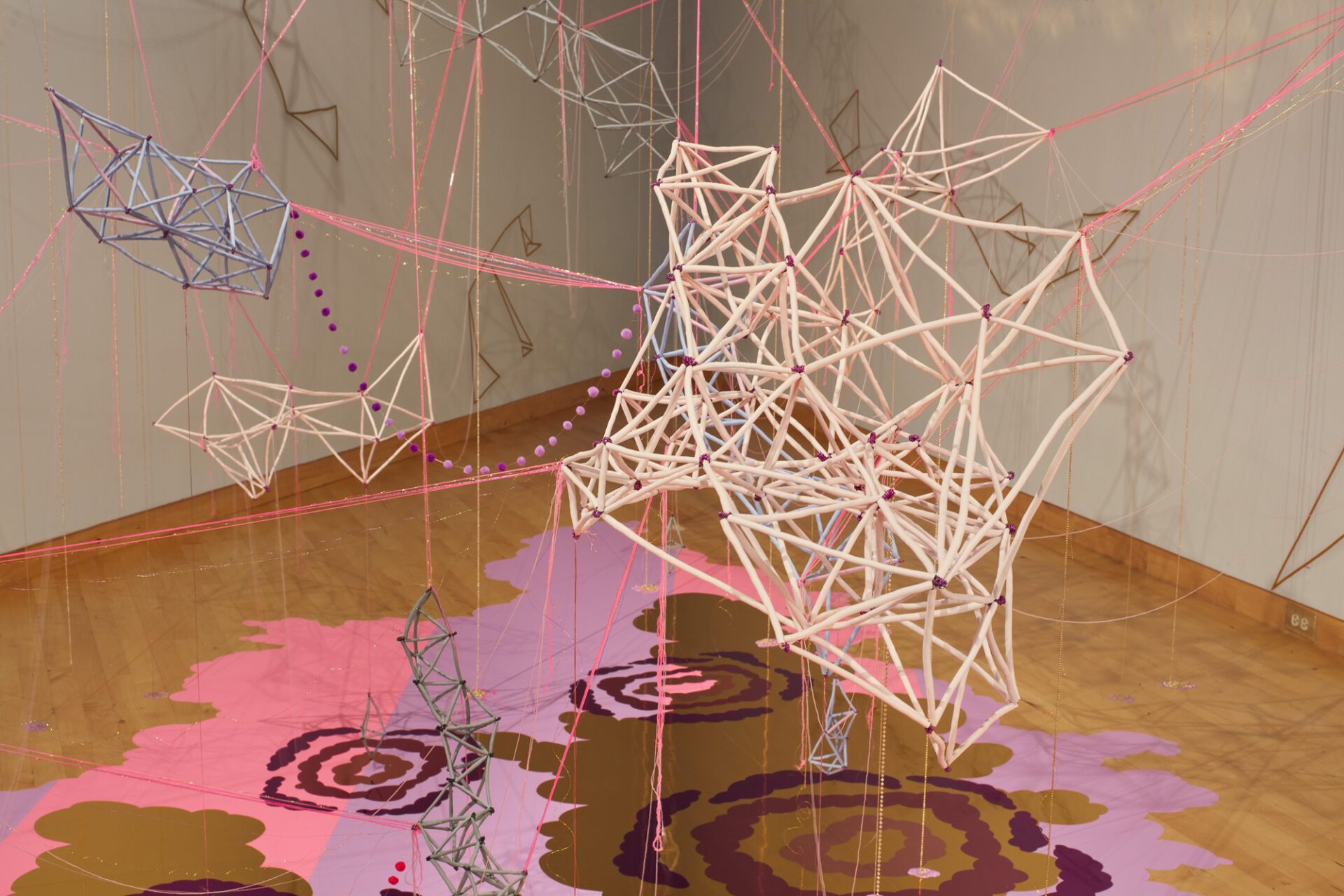 Sound of the flute calls from the 45-degree corner in the next gallery, Casey McDonough’s dot to line to plane to spheres site-specific installation. It’s melodic, silvery, gliding light and airy notes flowing in and out. McDonough has created what could be interpreted as the cosmos, and/or the quantum world of elemental particles, the micro/macro recalling William Blake’s “See the world in the grain of sand, and heaven in a wild flower. Hold infinity in the palm of your hand, and eternity in an hour.”