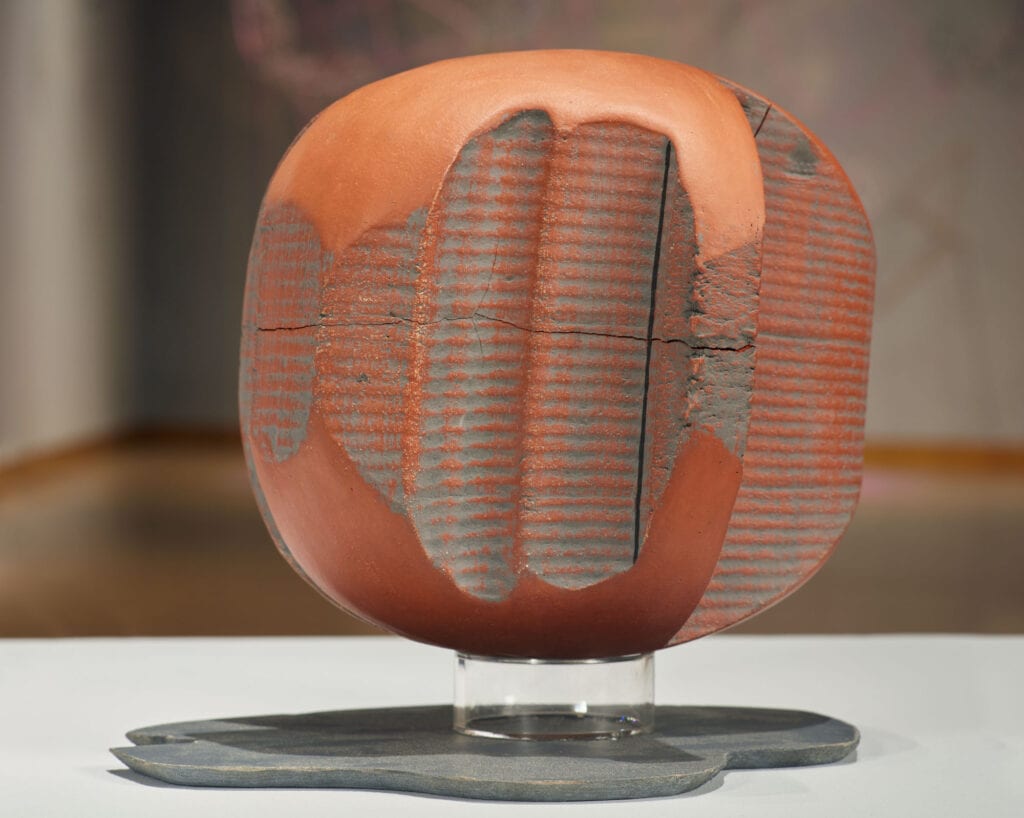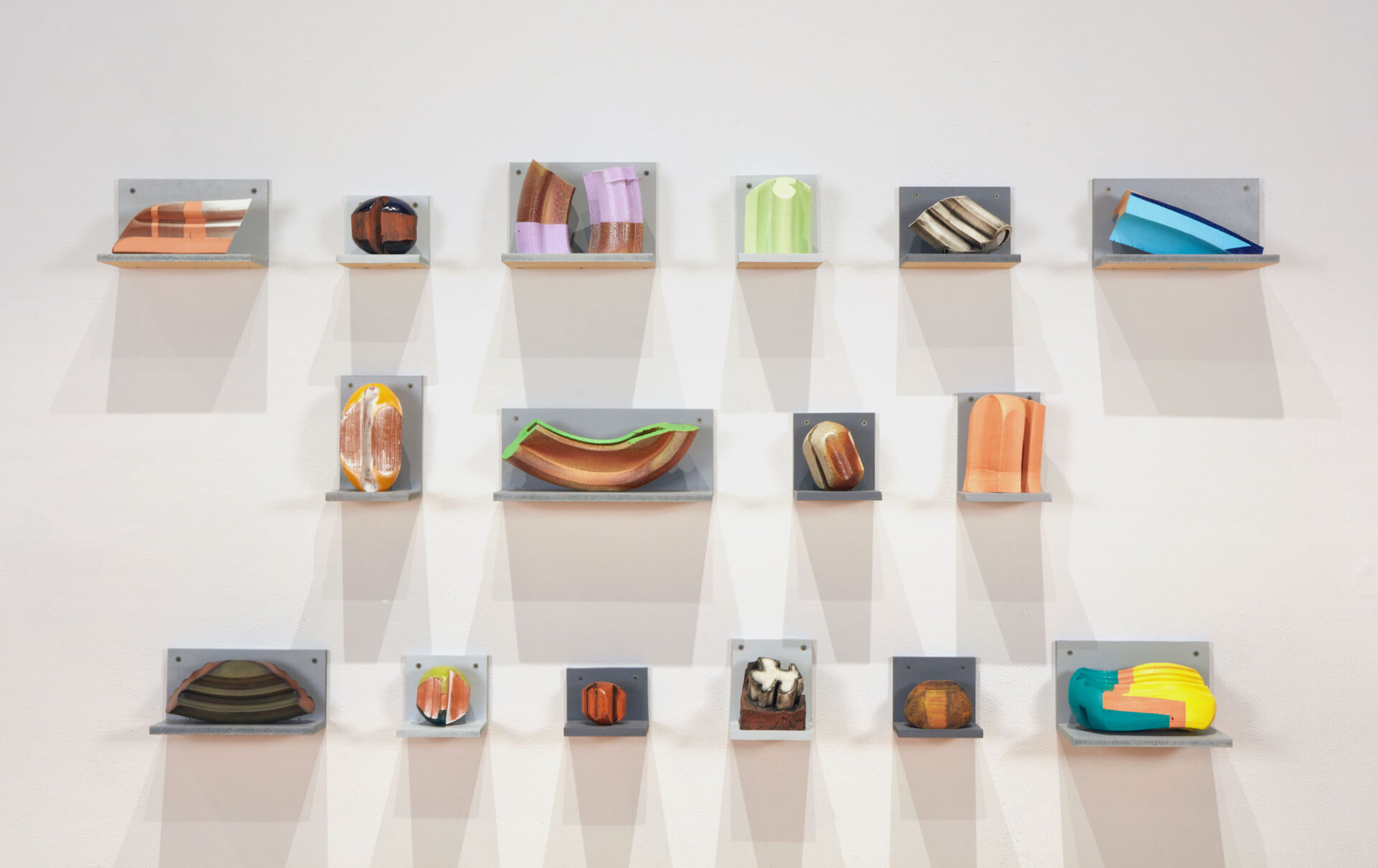 Kodi Thompson beats Earth’s drums, from which he gathers the substance to build his thick extruded clay bodies, like boulders the ancients placed in their rock circles whose meanings are lost in time, these monoliths now scaled way way down. Works that while still heavy, can be lifted by one human hand, as in the mega dinosaurs now needing field glasses to see their descendants in a contemporary birders’ watch list. Amazing how evolutionary scientists are able to trace the long and convoluted lineages. And even more amazing how DNA survives and adapts through millennia of geologic and human upheavals. But here we are, looking this grid of colorful extrusions mounted on a wall, like specimens, or product samples for a builder.