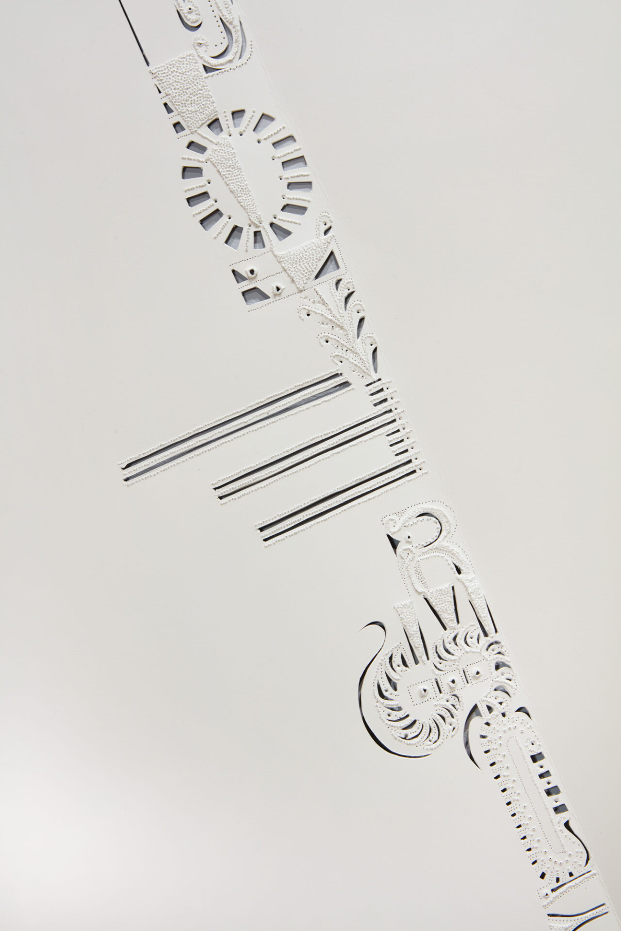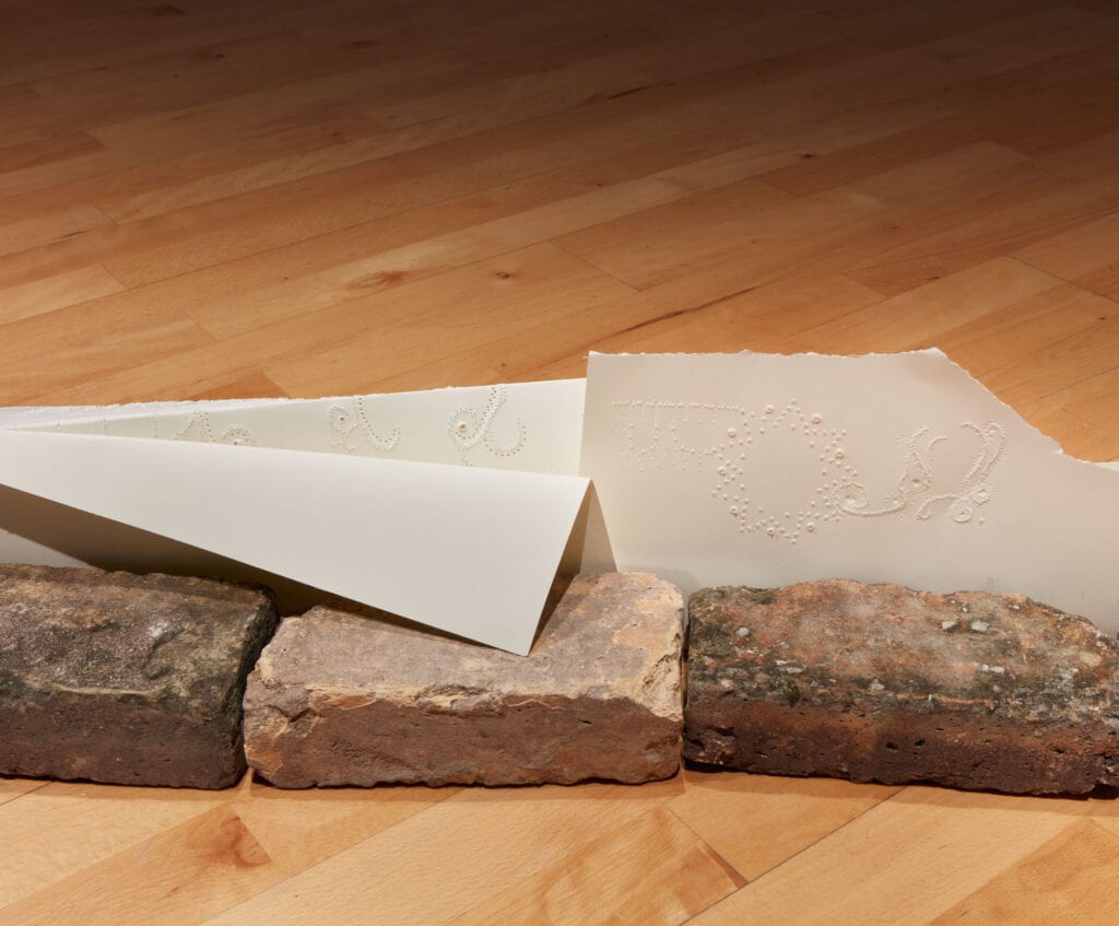 Facing this are Rosemarie Chiarlone’s piano pieces, playing from pianissimo to mezzo to forte, her four works sound through the galleries. An artist book, a line of weathered bricks and perforated paper installation like a cut on the floor, a grid of delicate embroidered silk chiffon nailed to the wall like flesh to the cross, and large perforated sheets of white paper like lace form another grid next to Red Falls. This is a dramatic interplay between the meek and the powerful, the inner sanctuary and the public square, navigating this duality when one’s only guide is surety in the self.