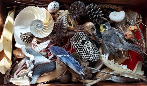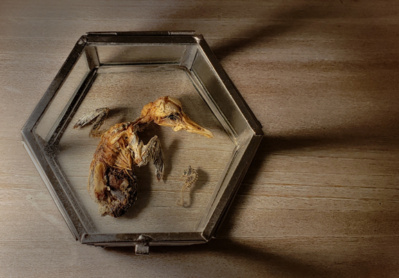 Detail of found baby bird and seahorse